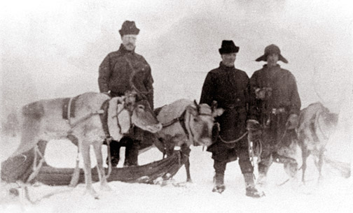 Poromiehiä lähdössä ettotöihin Jokelan pihalla Vaalajärvellä. Vasemmalla Augusti Toimela ja hänen veljenpoikansa Felix Niemelä.