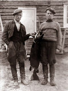 Suuri lohi, jonka miehet ovat saaneet Kitisestä, Eemeli Huovinen ja Leo Karppinen pitävät kojamoa, kuvannut Eevert Hurtig 6.8.1937 Puttaalla.