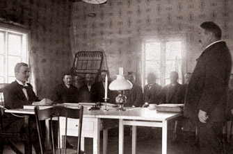 Käräjäistunto Sodankylän käräjätuvalla, takana vasemmalla Juho Koivu, Heikki Hannula, Ludvig Tepsa nimismies Roinilan takana oikealla.