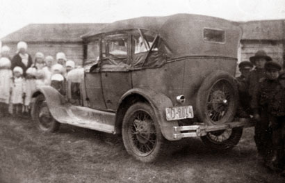 Ensimmäinen auto Seipäjärven kylässä, ajurina August Moberg. Kuva: Wiljam Niemelä.